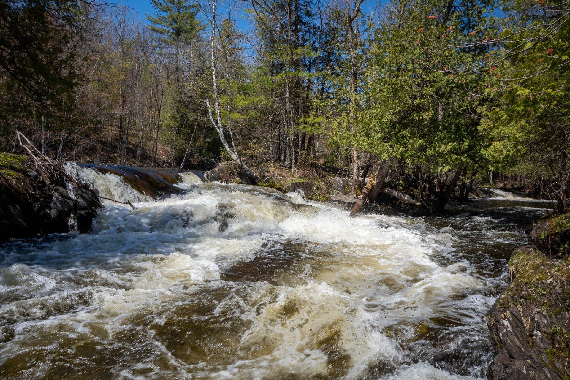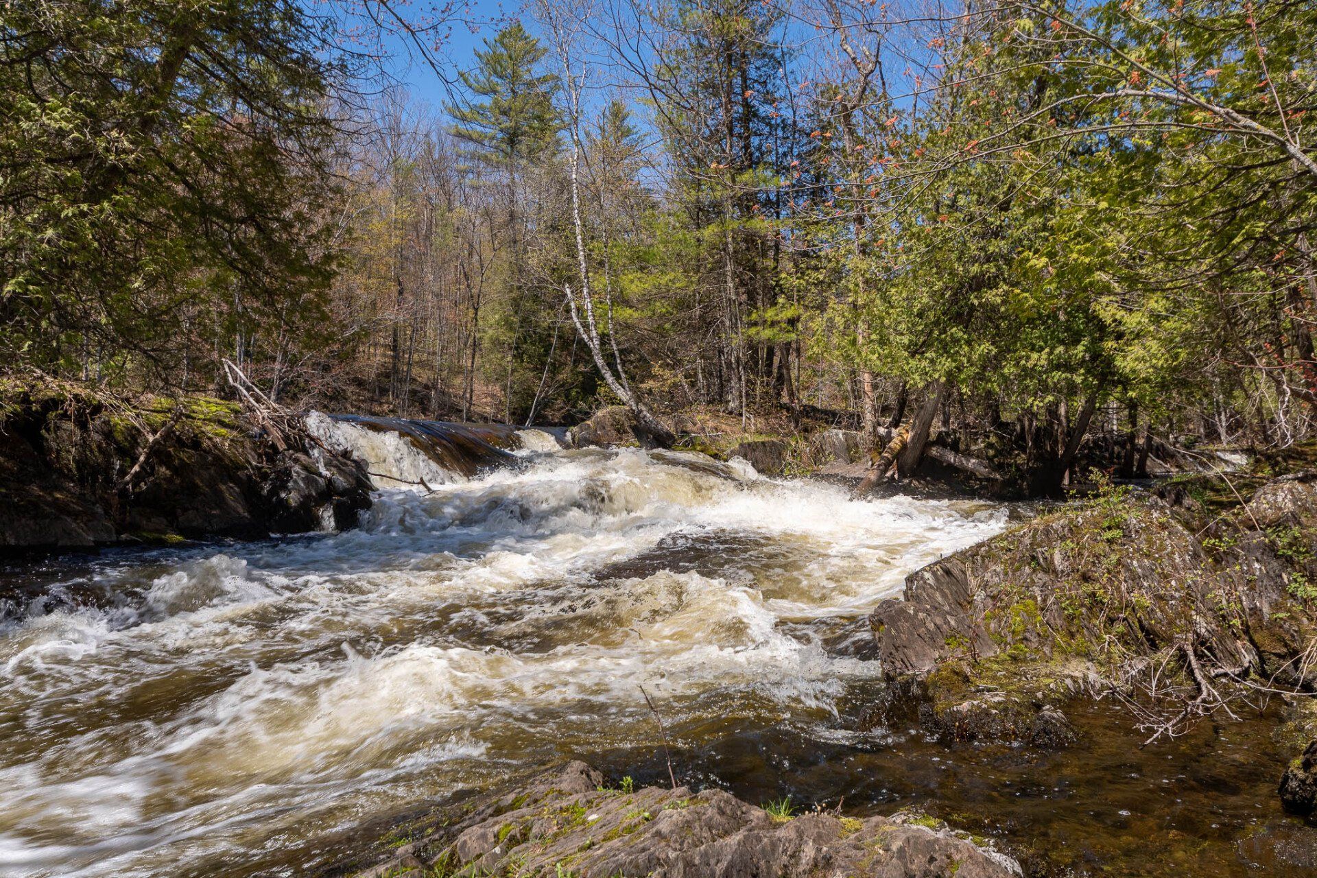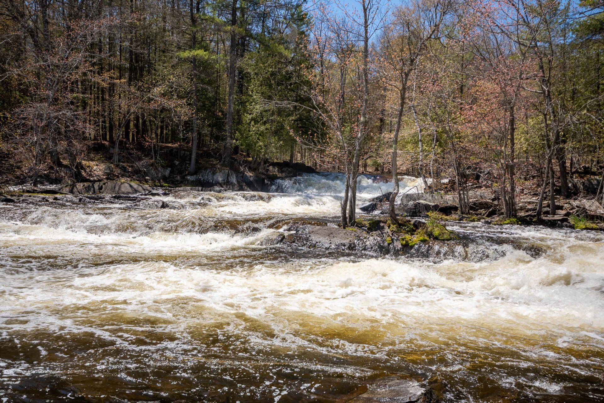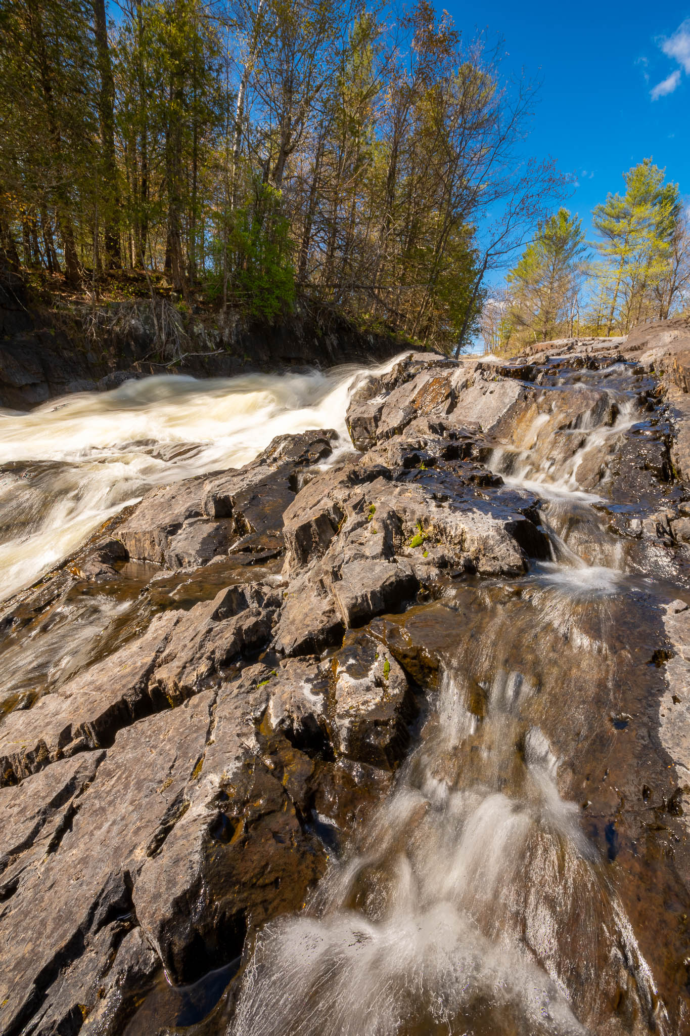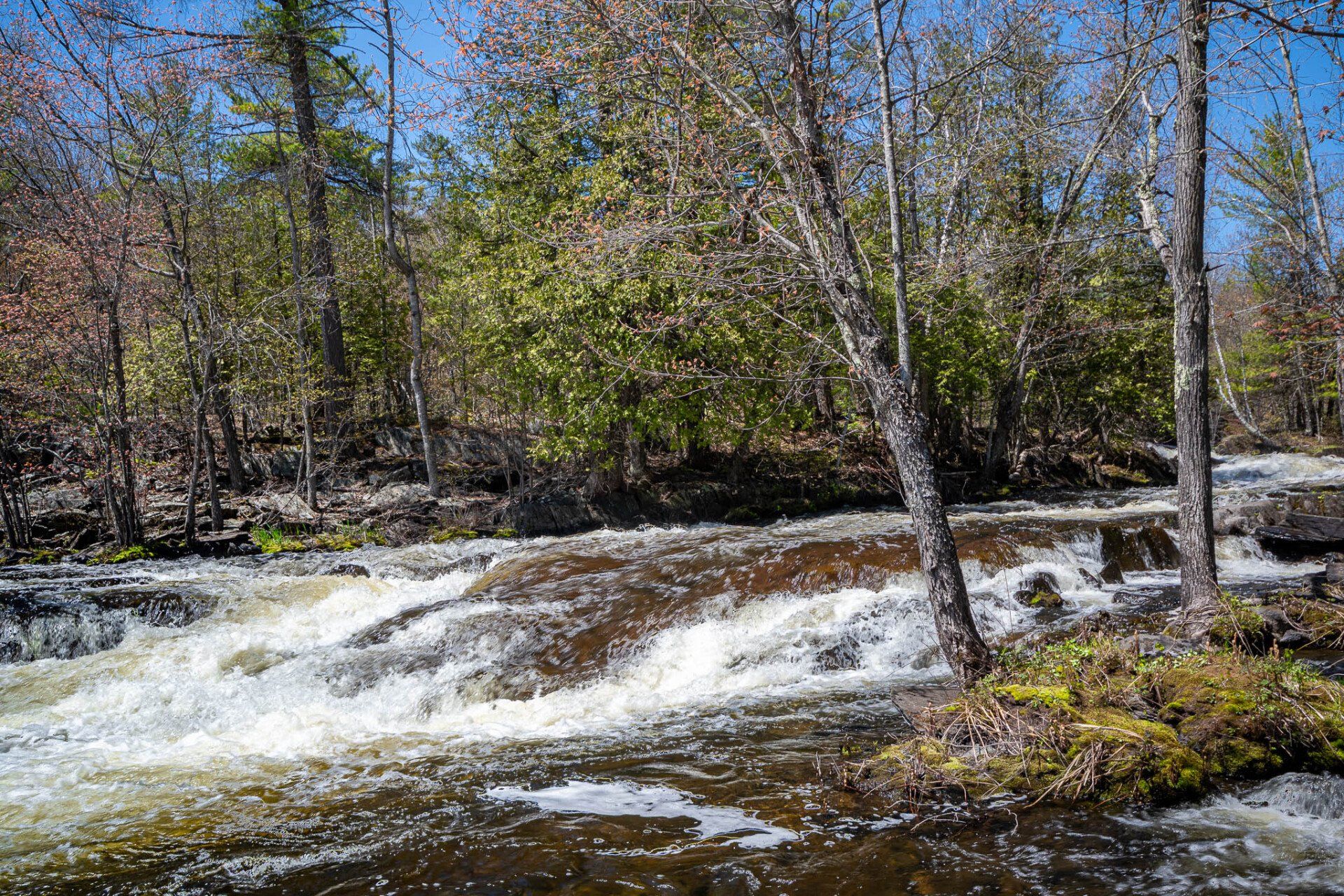 The largest, Upper Cordova Falls is found immediately below a dam at the southern outlet of Cordova Lake. Here, the Crowe River tumbles down a narrow rocky channel perhaps 100 metres long. The river drops about 10 metres, falling not as one main cascade, but rather in at least five distinct smaller drops, separated by short pools. By walking along a poorly marked trail leading south from the dam, you can get to the lower reaches of the falls.
