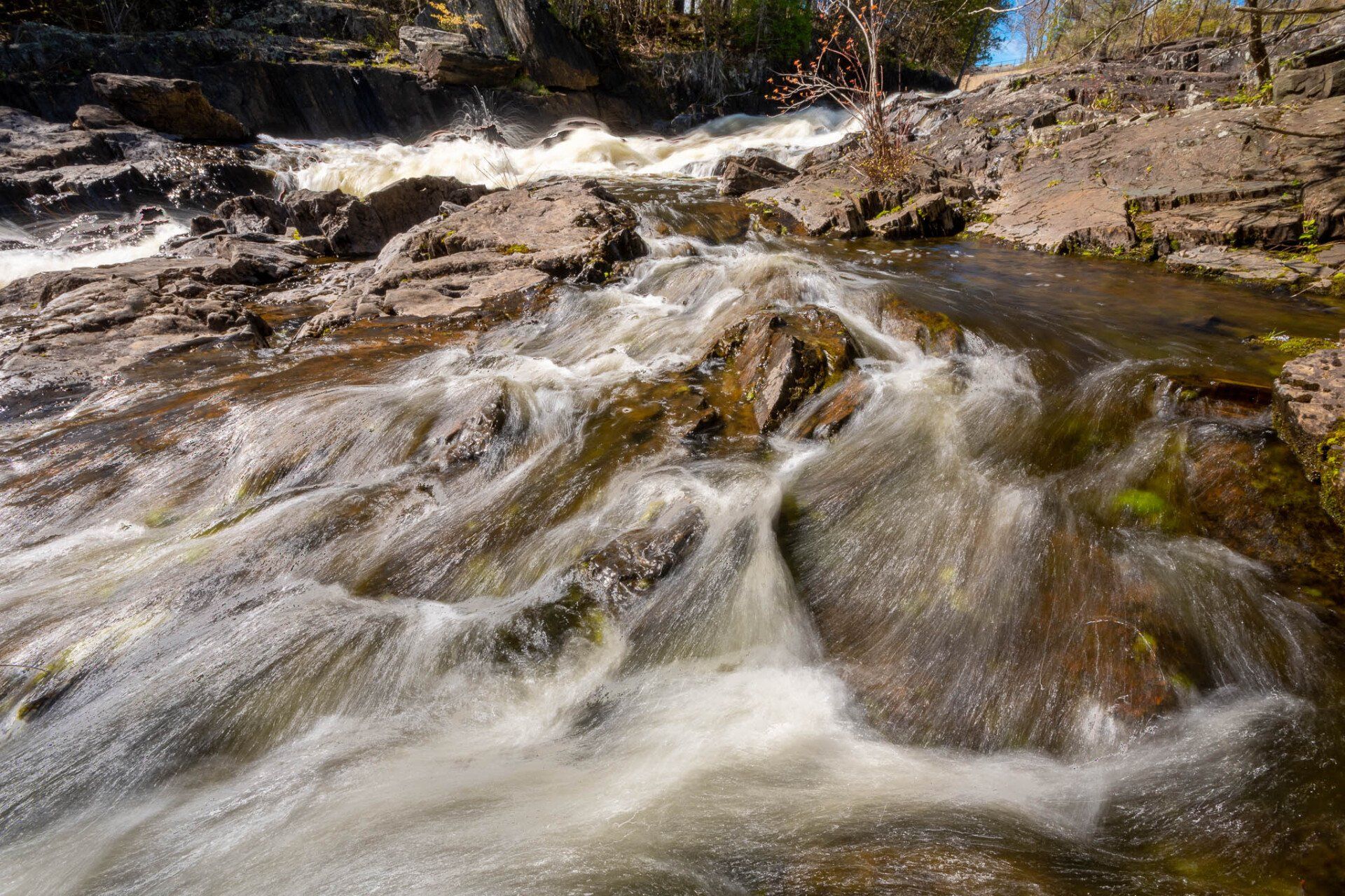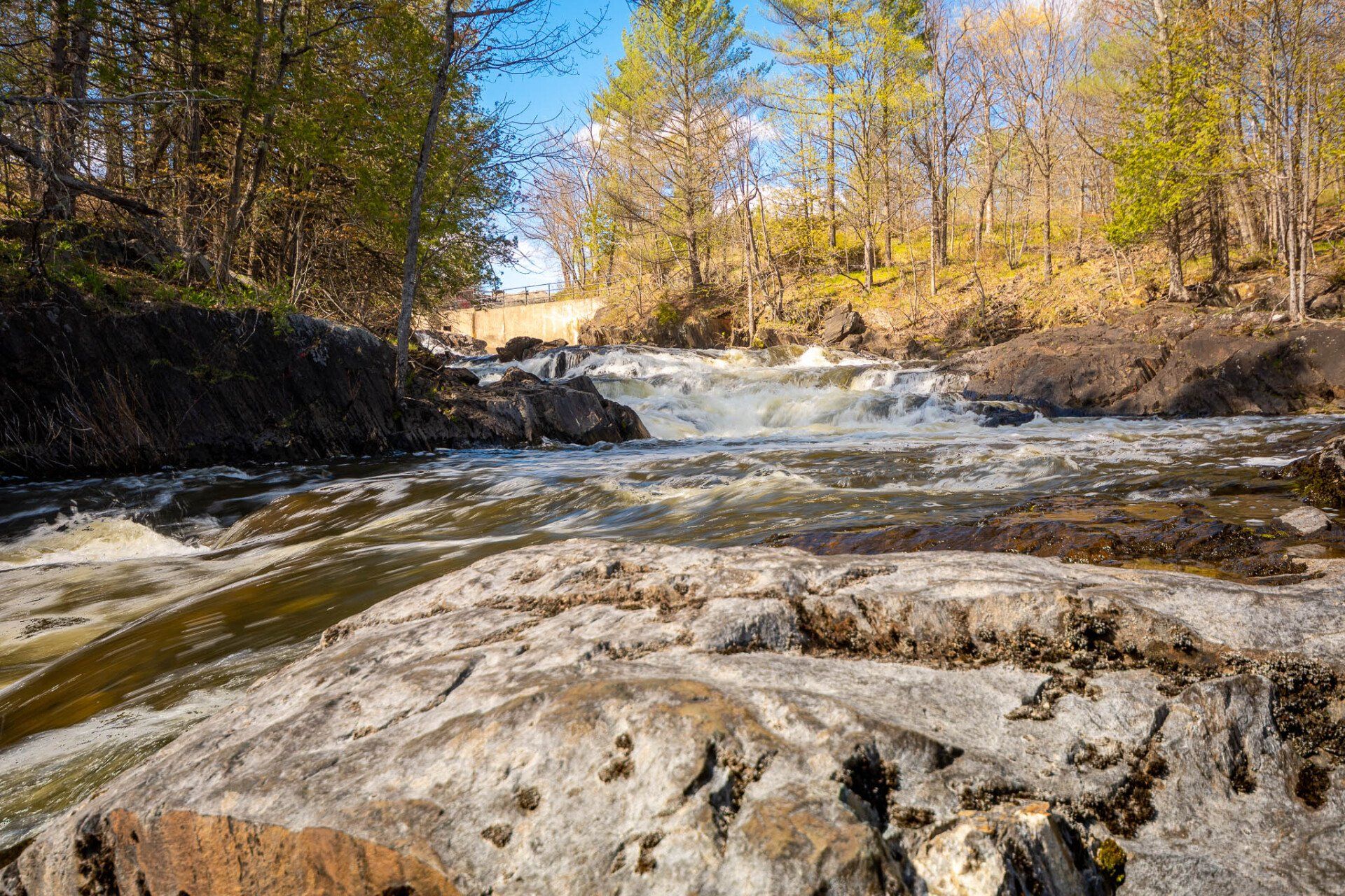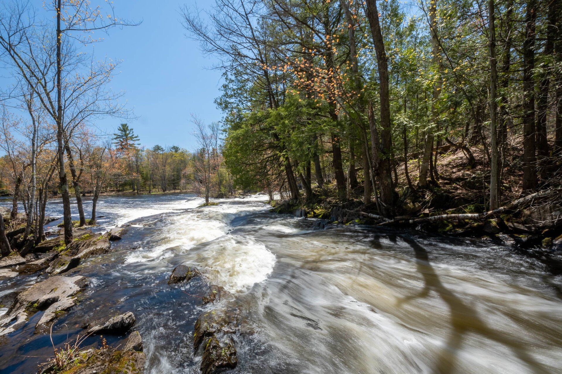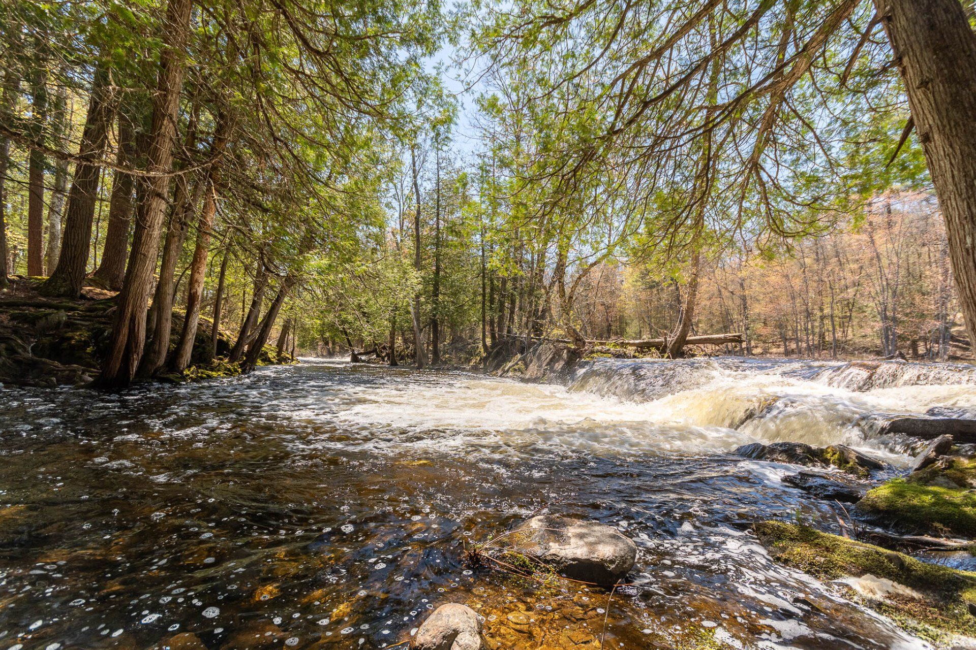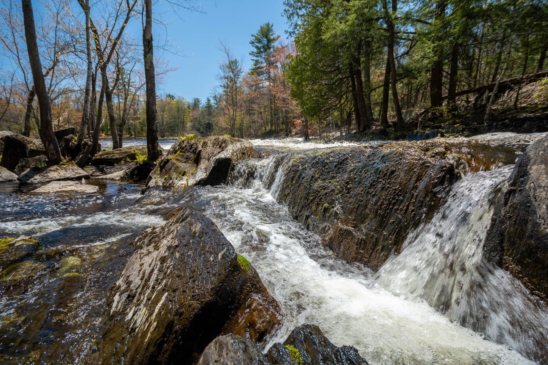 The largest, Upper Cordova Falls is found immediately below a dam at the southern outlet of Cordova Lake. Here, the Crowe River tumbles down a narrow rocky channel perhaps 100 metres long. The river drops about 10 metres, falling not as one main cascade, but rather in at least five distinct smaller drops, separated by short pools. By walking along a poorly marked trail leading south from the dam, you can get to the lower reaches of the falls.