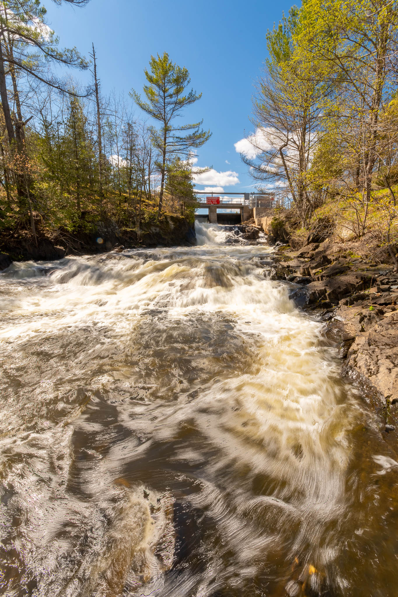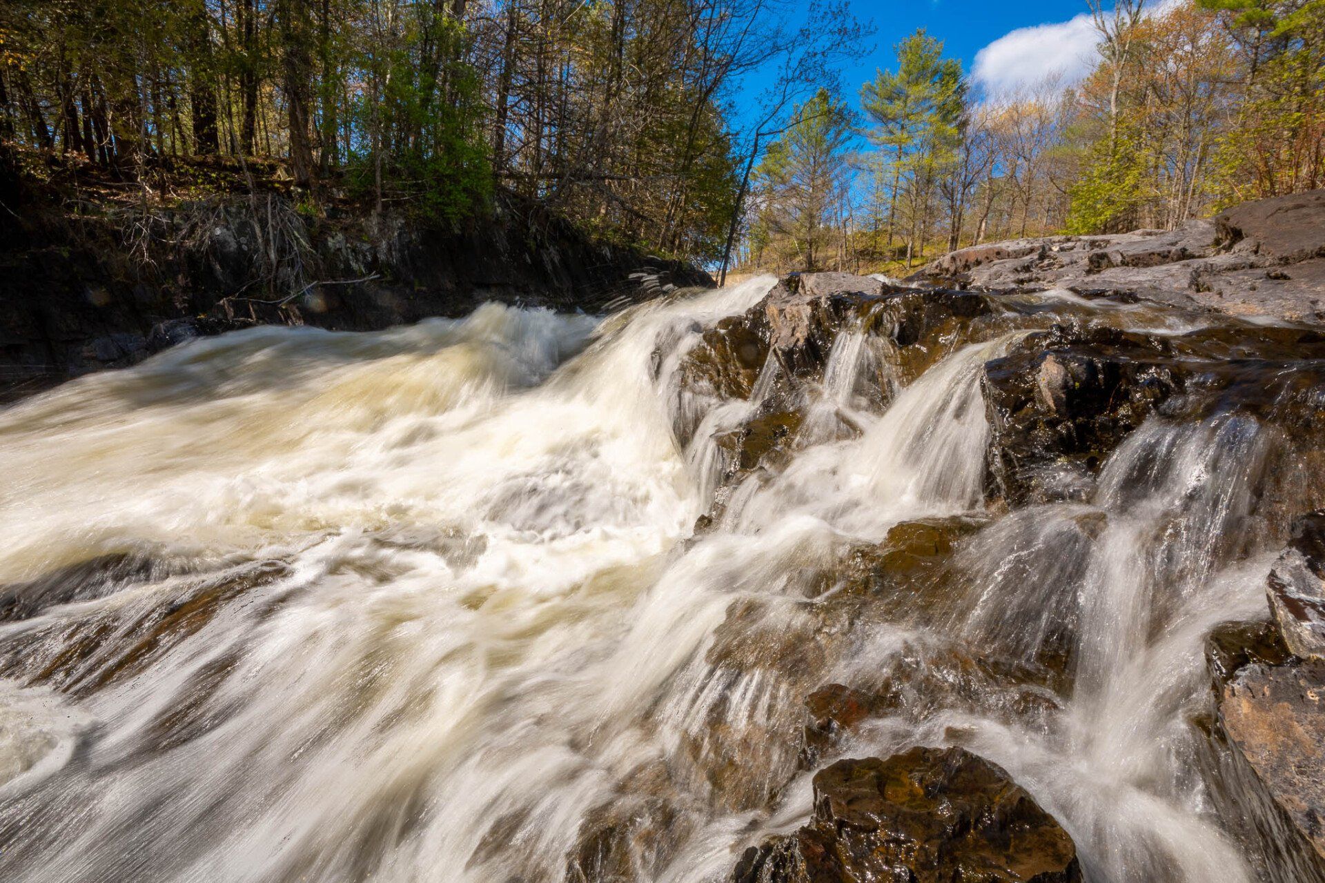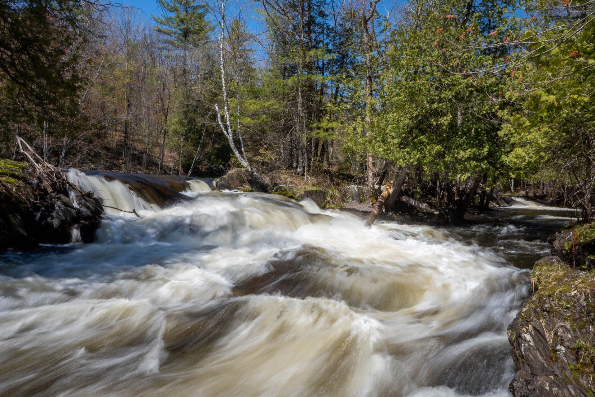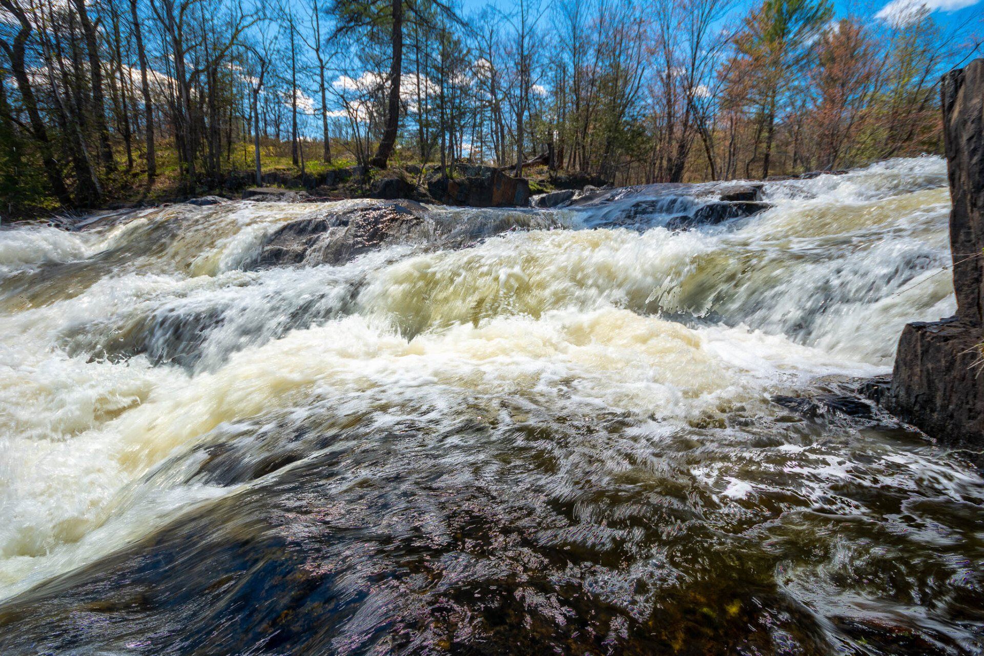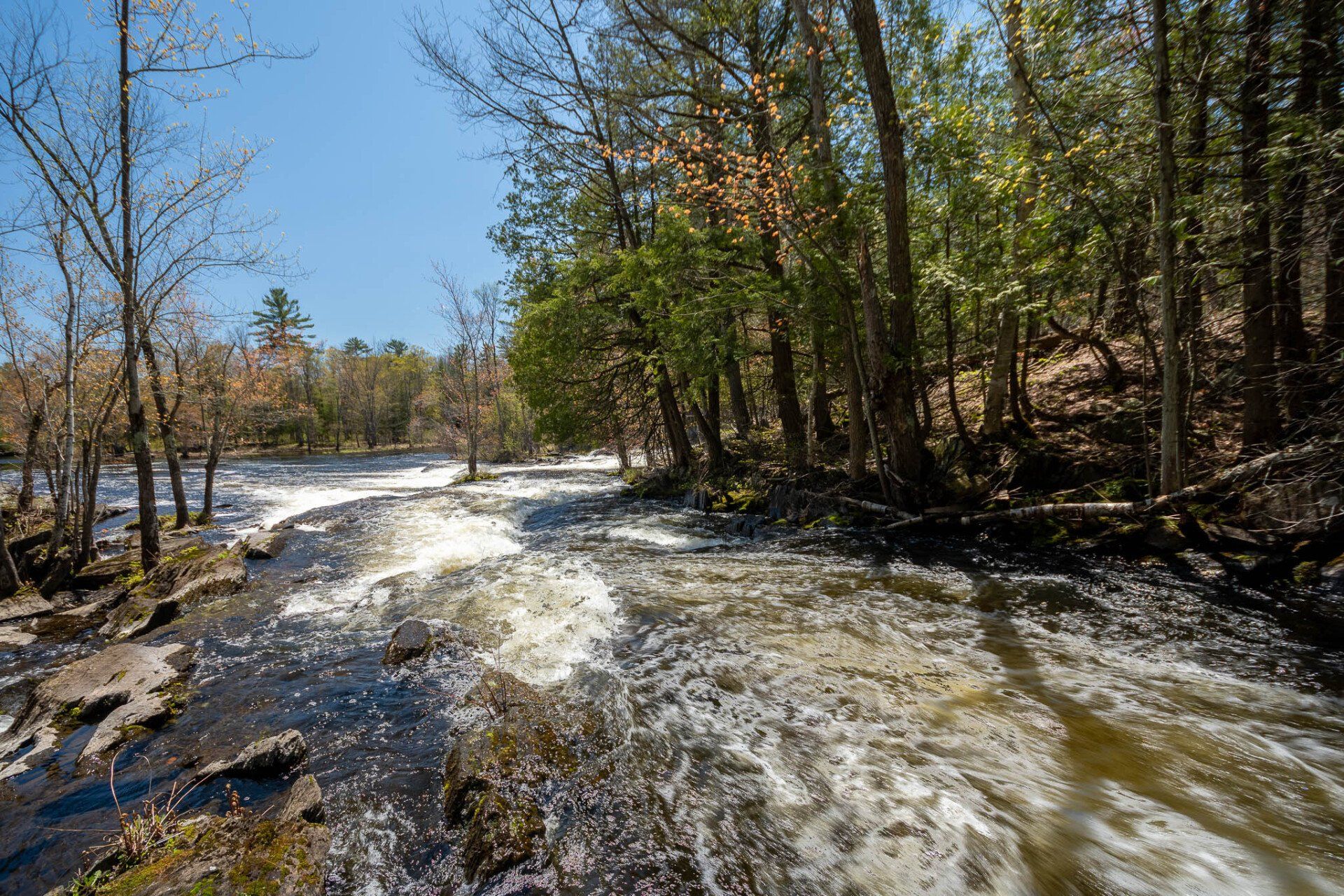 The largest, Upper Cordova Falls is found immediately below a dam at the southern outlet of Cordova Lake. Here, the Crowe River tumbles down a narrow rocky channel perhaps 100 metres long. The river drops about 10 metres, falling not as one main cascade, but rather in at least five distinct smaller drops, separated by short pools. By walking along a poorly marked trail leading south from the dam, you can get to the lower reaches of the falls.
