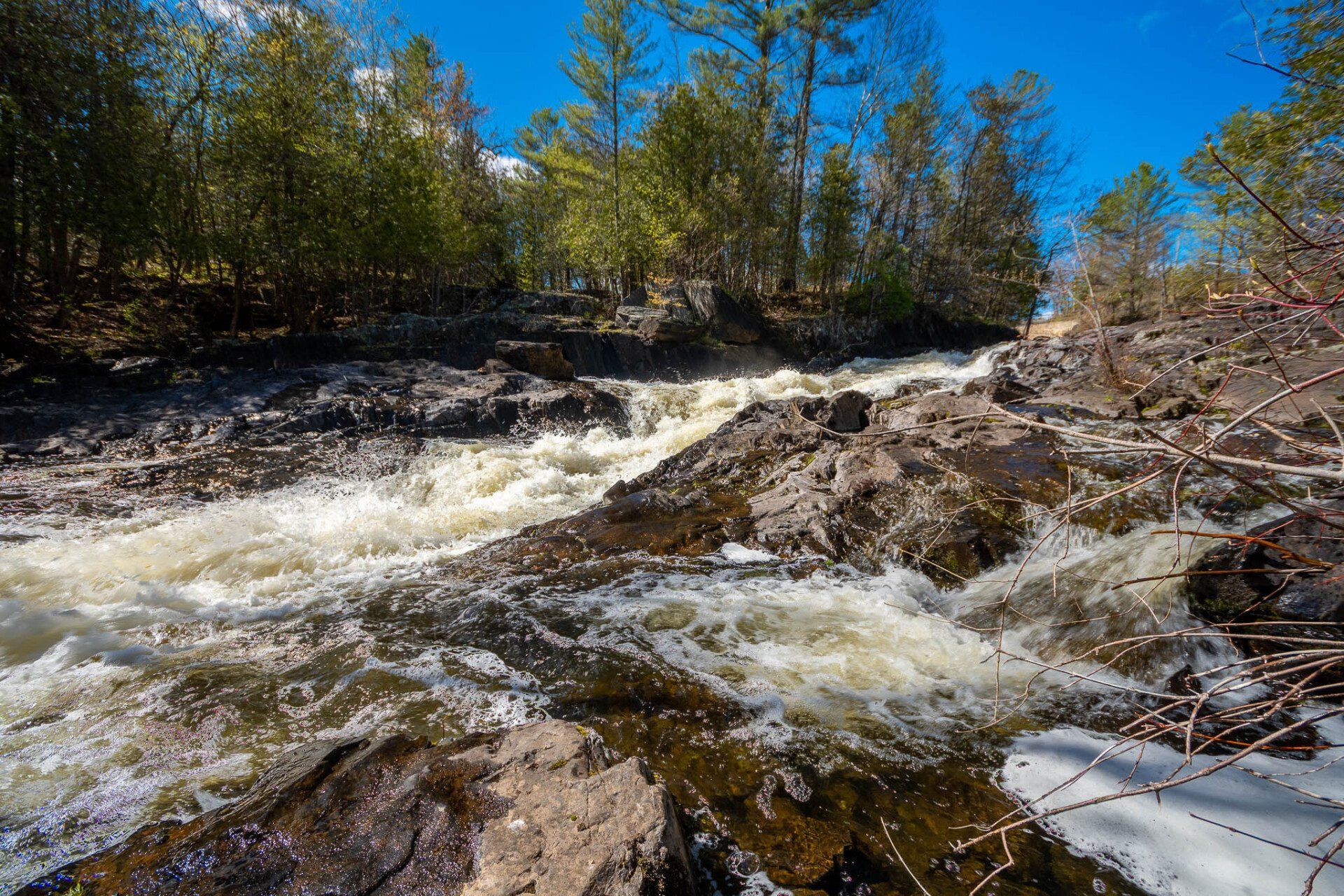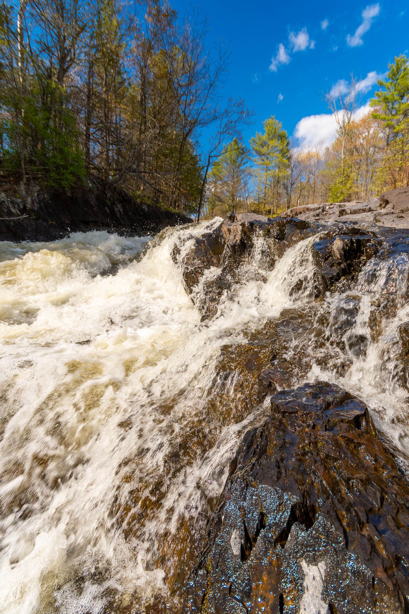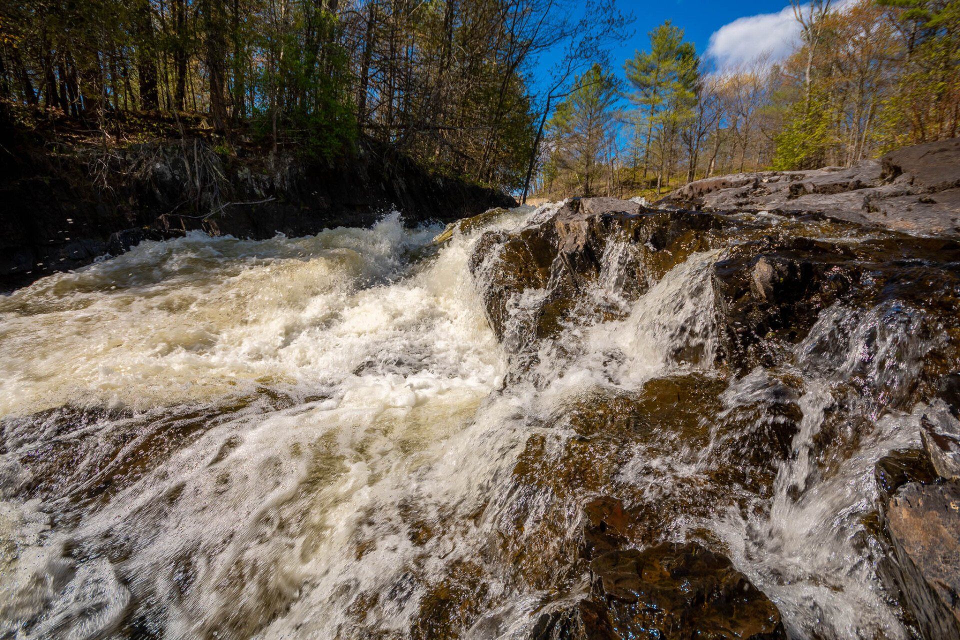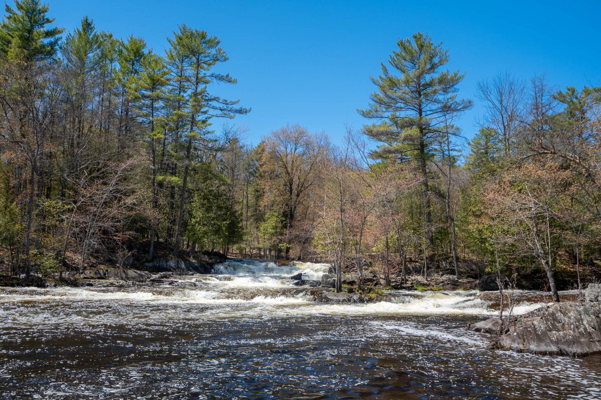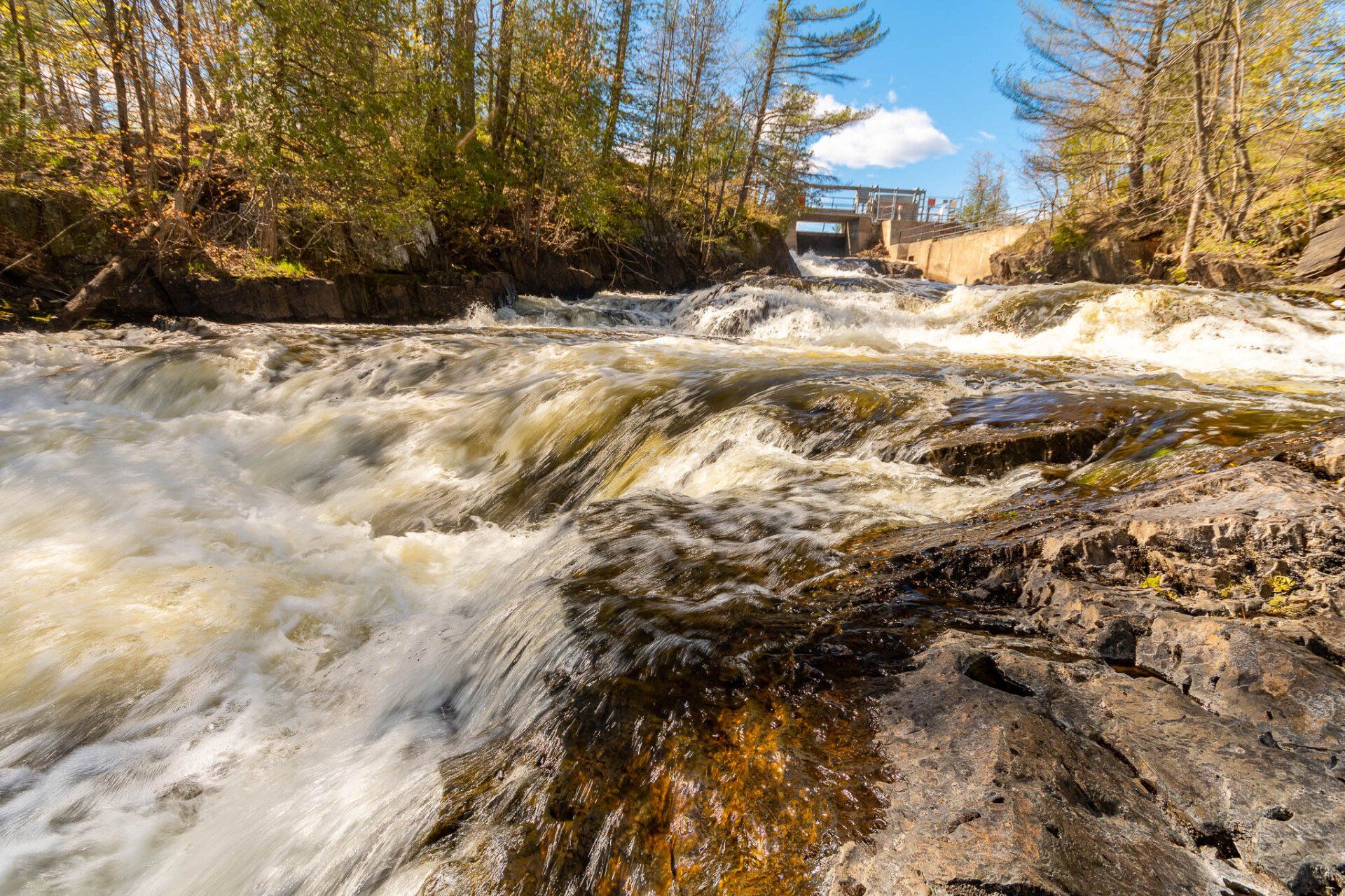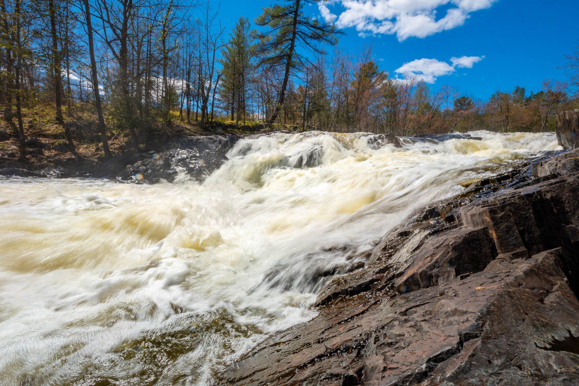 The largest, Upper Cordova Falls is found immediately below a dam at the southern outlet of Cordova Lake. Here, the Crowe River tumbles down a narrow rocky channel perhaps 100 metres long. The river drops about 10 metres, falling not as one main cascade, but rather in at least five distinct smaller drops, separated by short pools. By walking along a poorly marked trail leading south from the dam, you can get to the lower reaches of the falls.