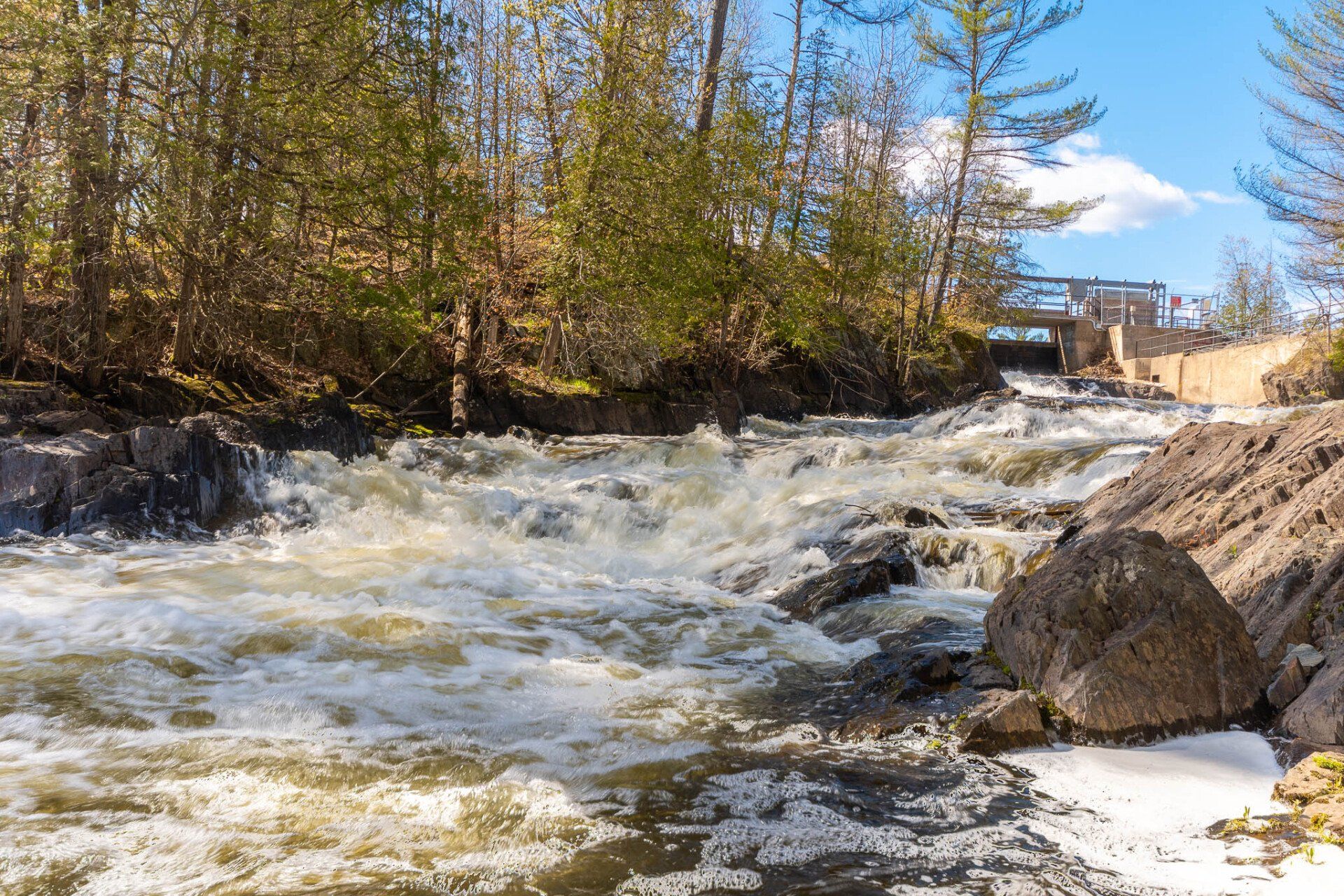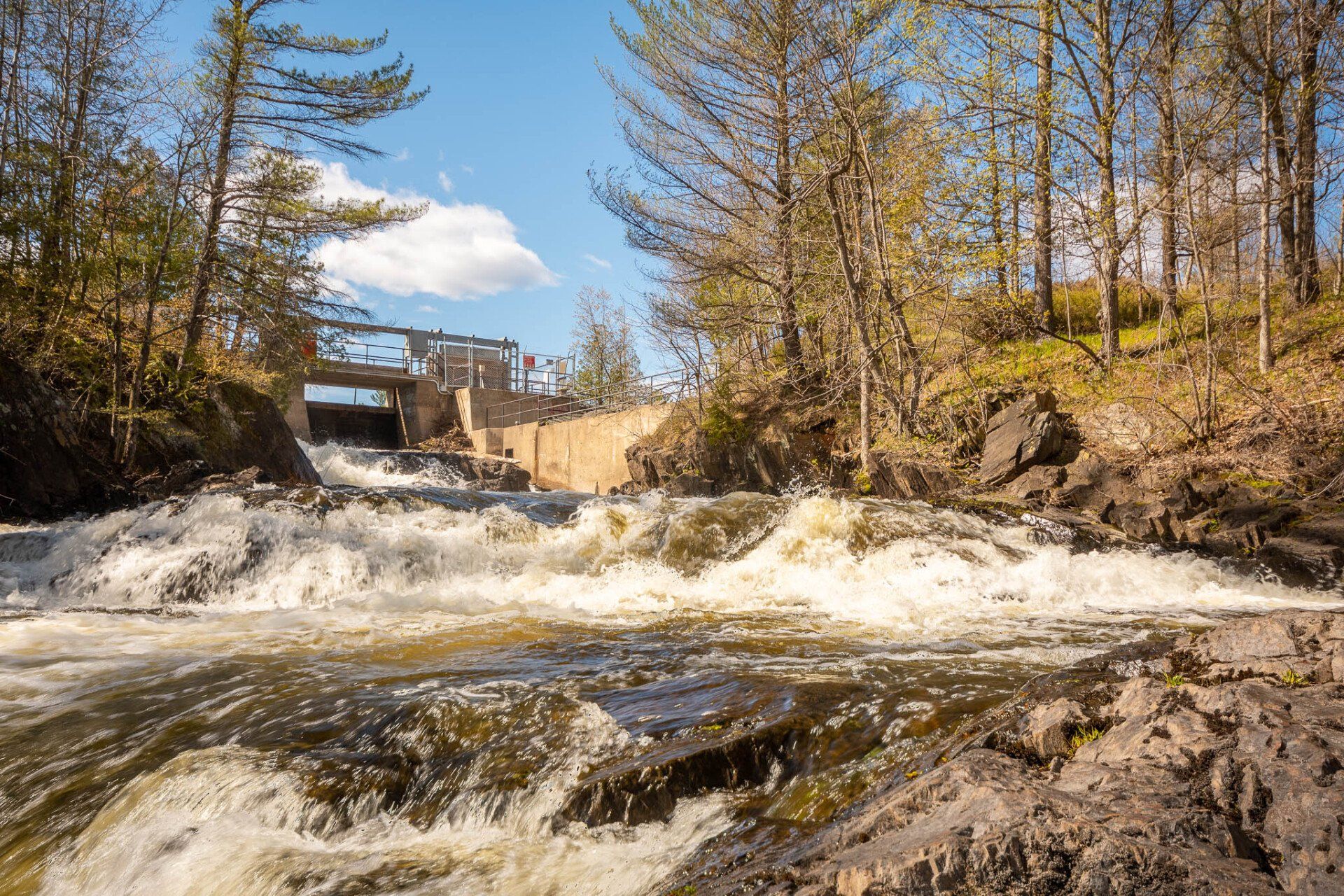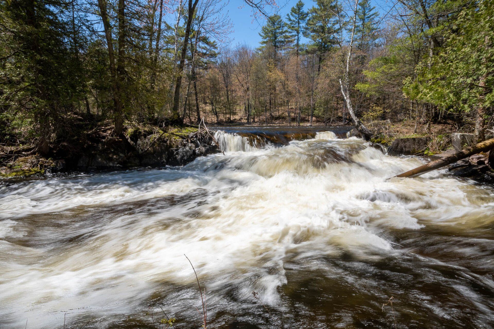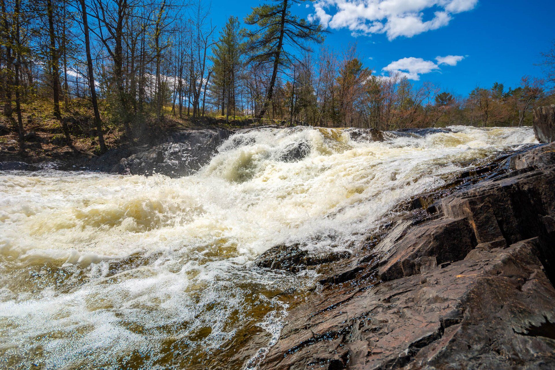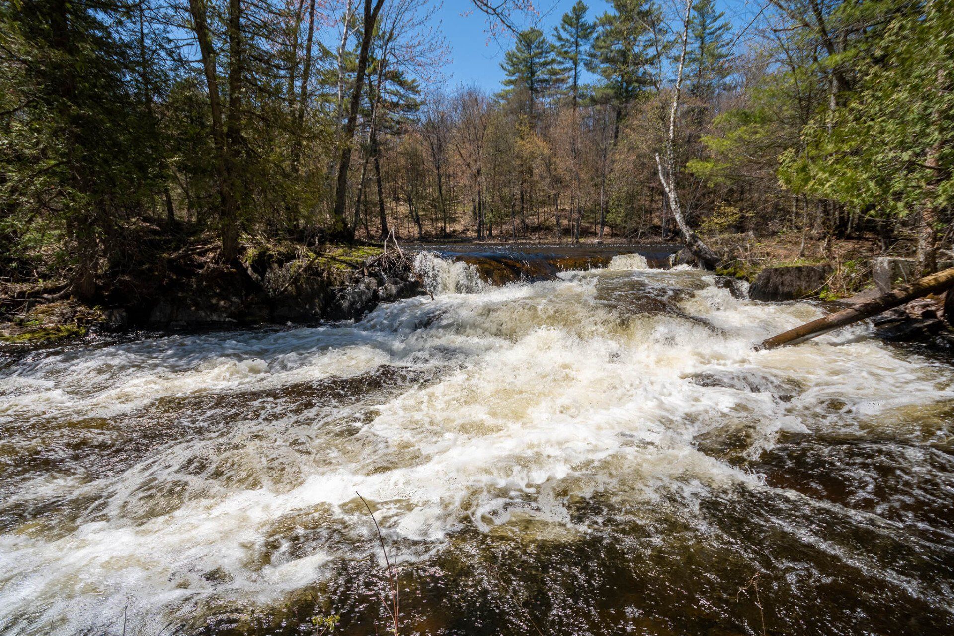 The largest, Upper Cordova Falls is found immediately below a dam at the southern outlet of Cordova Lake. Here, the Crowe River tumbles down a narrow rocky channel perhaps 100 metres long. The river drops about 10 metres, falling not as one main cascade, but rather in at least five distinct smaller drops, separated by short pools. By walking along a poorly marked trail leading south from the dam, you can get to the lower reaches of the falls.
