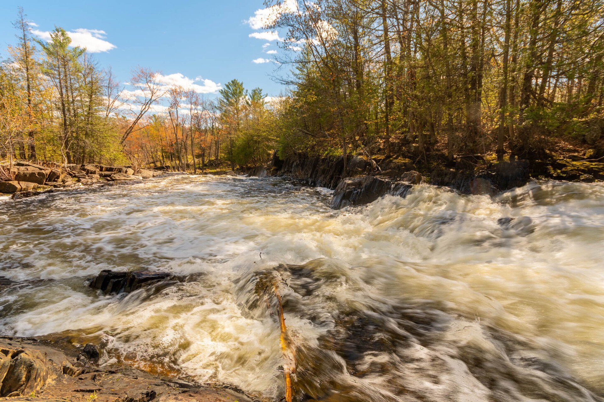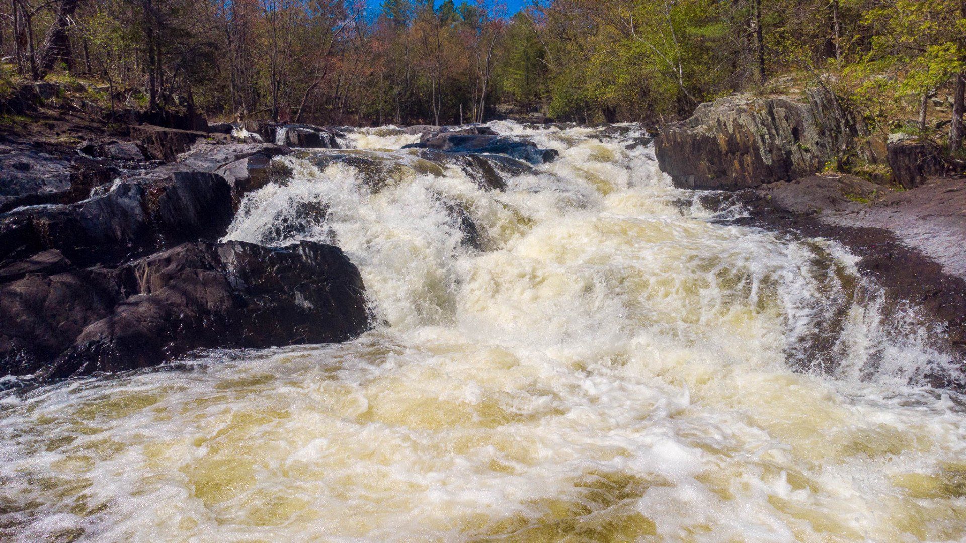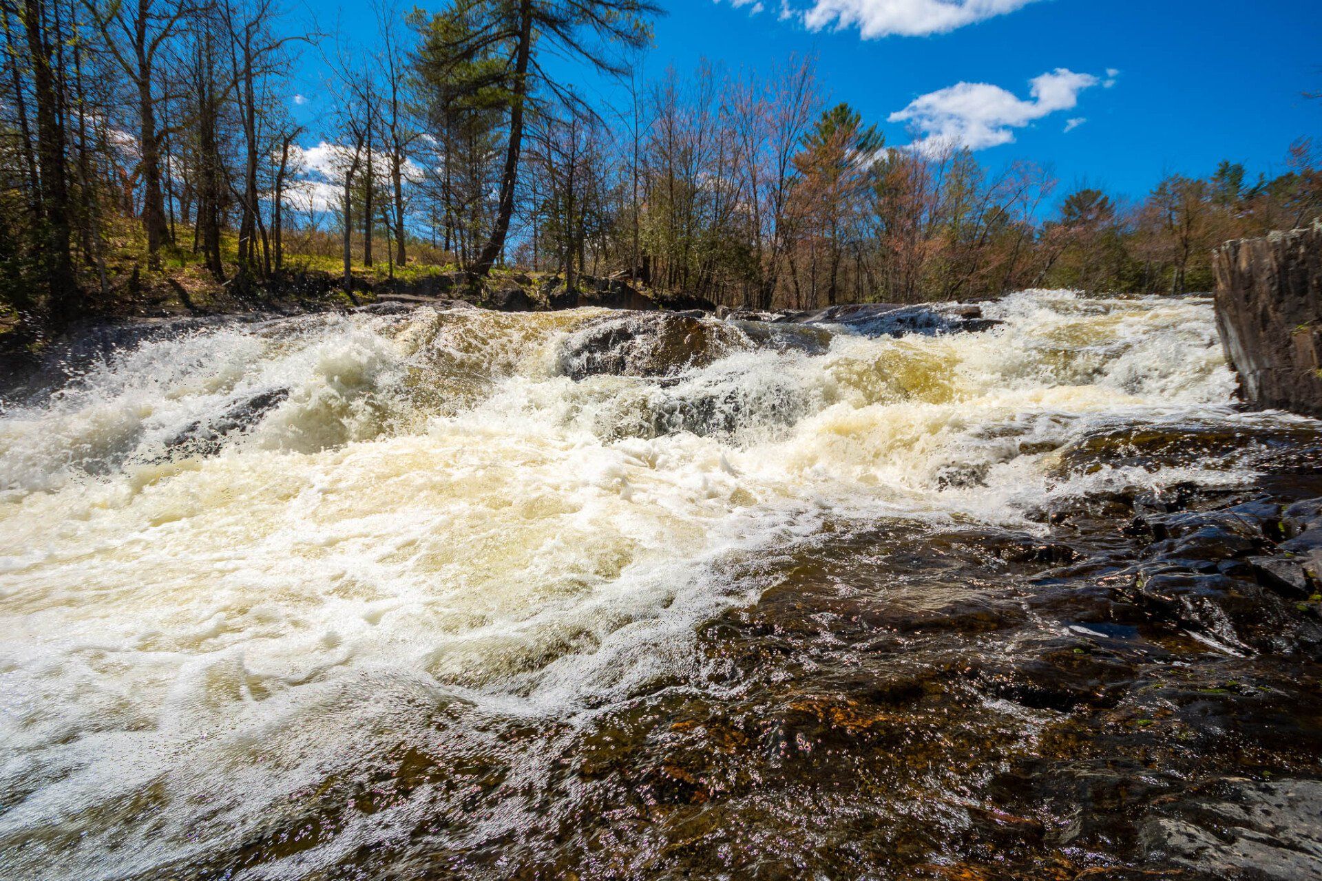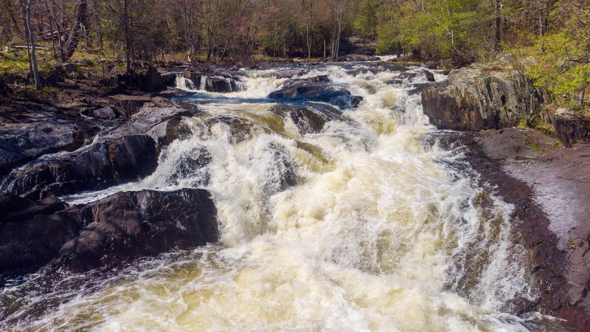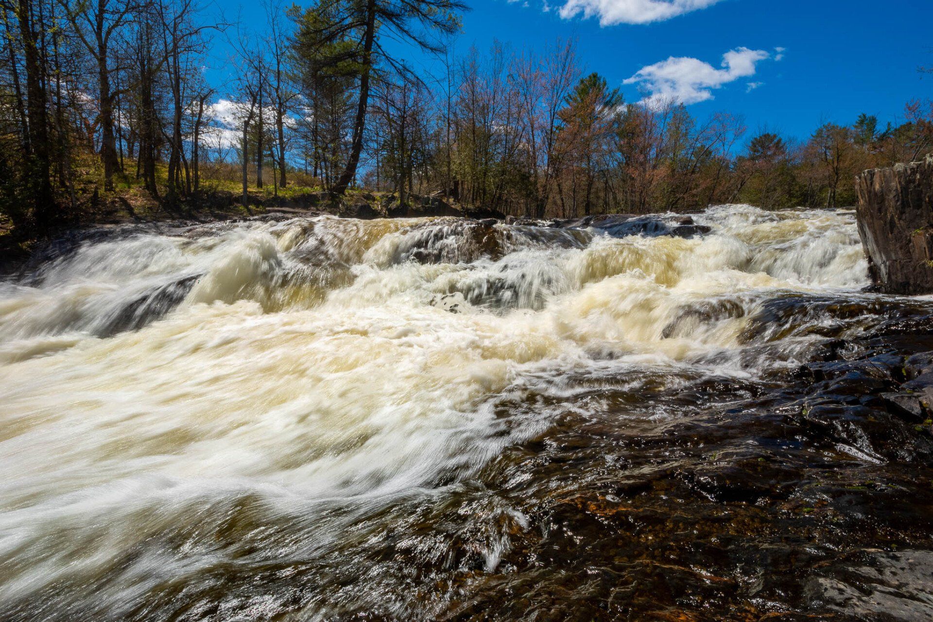 The largest, Upper Cordova Falls is found immediately below a dam at the southern outlet of Cordova Lake. Here, the Crowe River tumbles down a narrow rocky channel perhaps 100 metres long. The river drops about 10 metres, falling not as one main cascade, but rather in at least five distinct smaller drops, separated by short pools. By walking along a poorly marked trail leading south from the dam, you can get to the lower reaches of the falls.