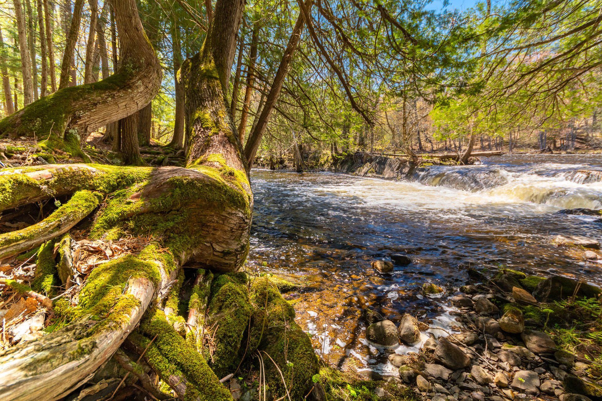 Lower Cordova Falls are the smallest, but are located beside a beautiful rock-floored clearing in the woods. You’ll find them hidden at the end of a short driveway on the right side of the road a few minutes’ drive further south. is perhaps the most photogenic of the three waterfalls, forming a pretty five-metre-high cascade set among cedars and hemlocks.