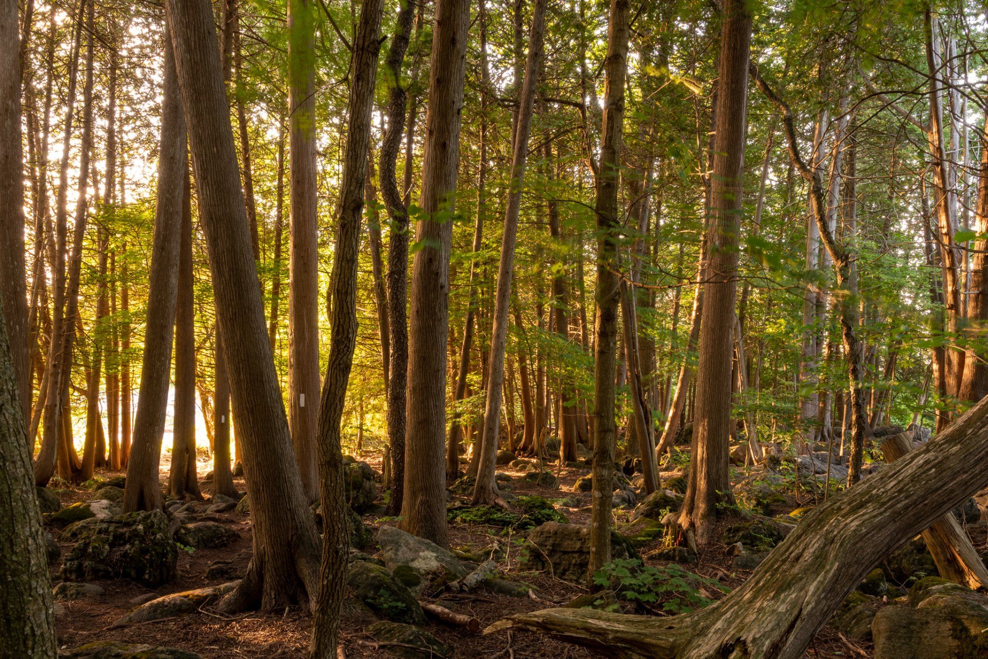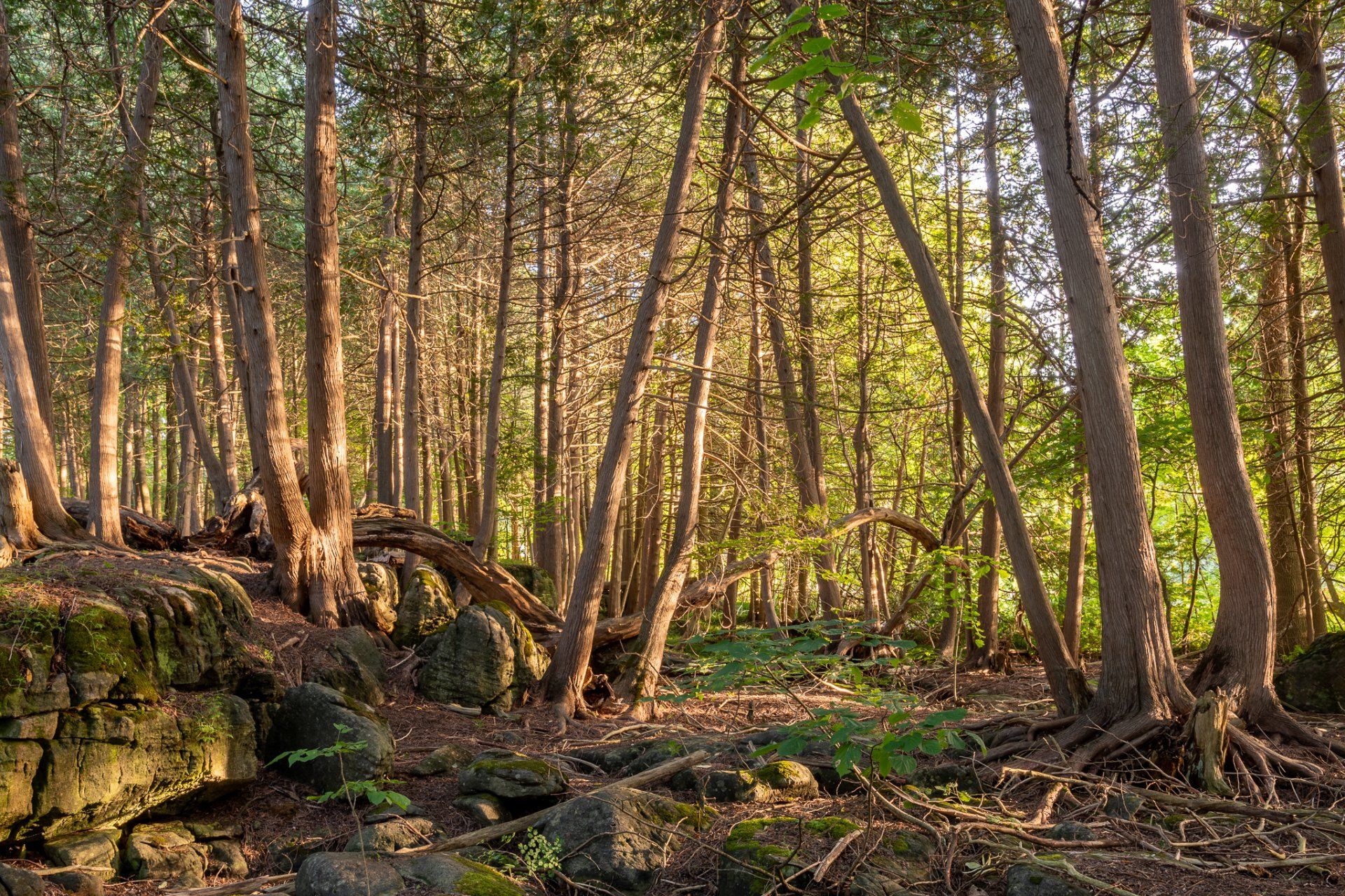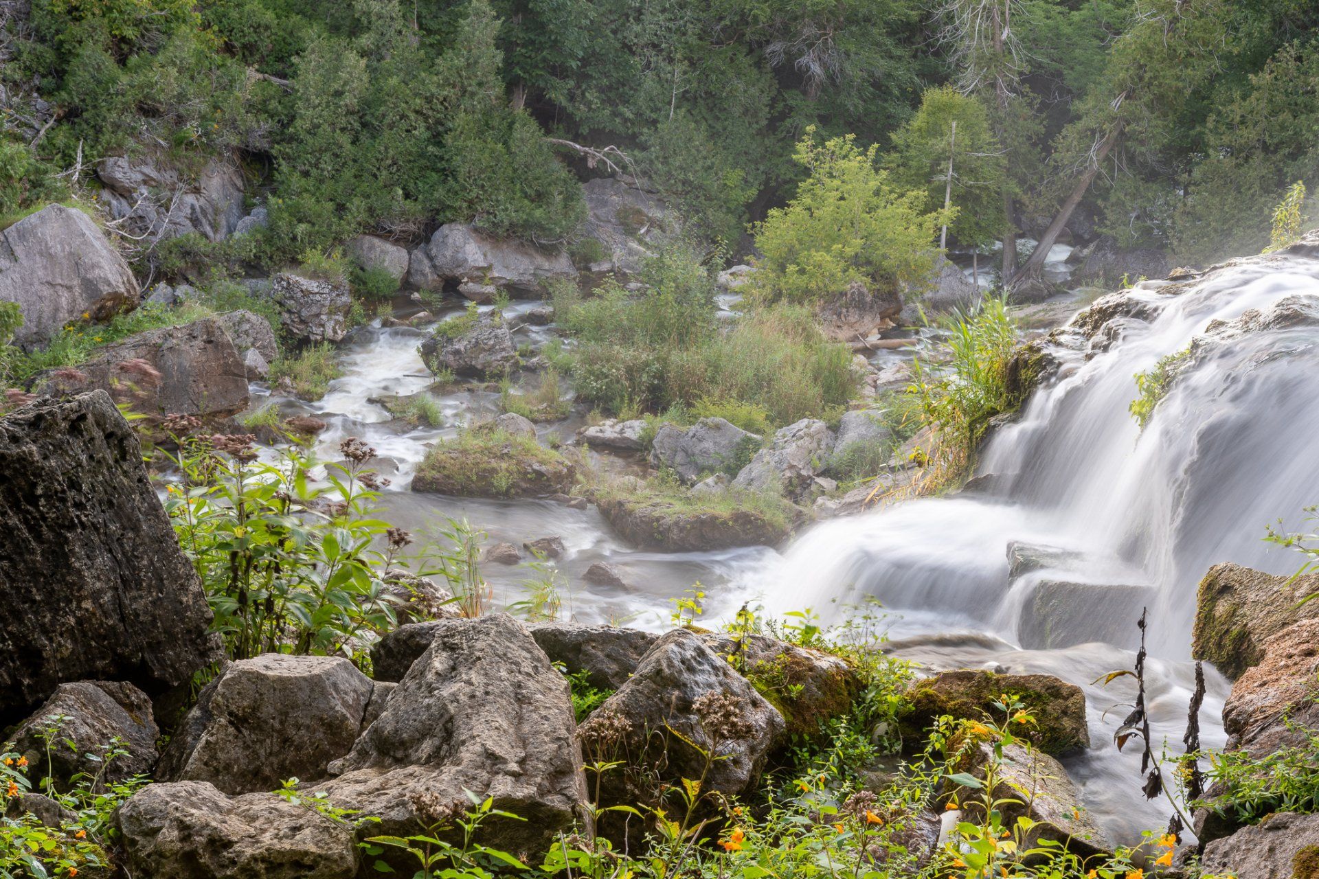 Situated in the heart of the 200-hectare Inglis Falls Conservation Area, Inglis Falls is an 18-metre-high (59 ft) cascade, created by the Sydenham River meeting the edge of the Niagara Escarpment. Swimming is prohibited in the entire area but it is possible to hike down to the base of the waterfall.. The Conservation Area includes 7.42 km of hiking and mountain bike trails.