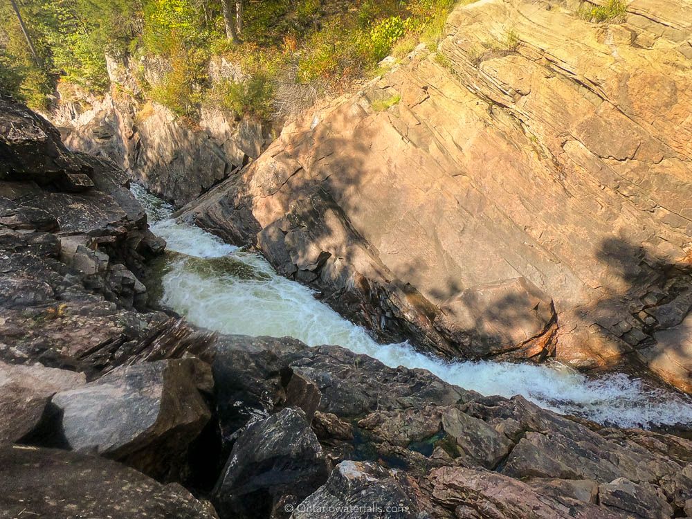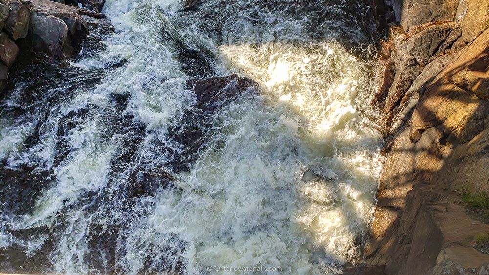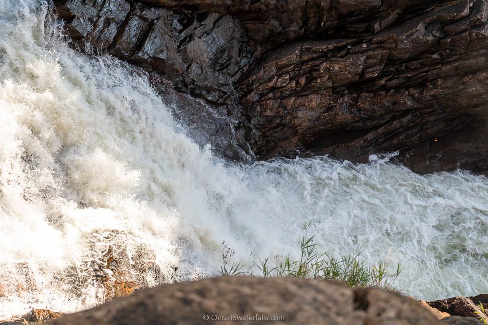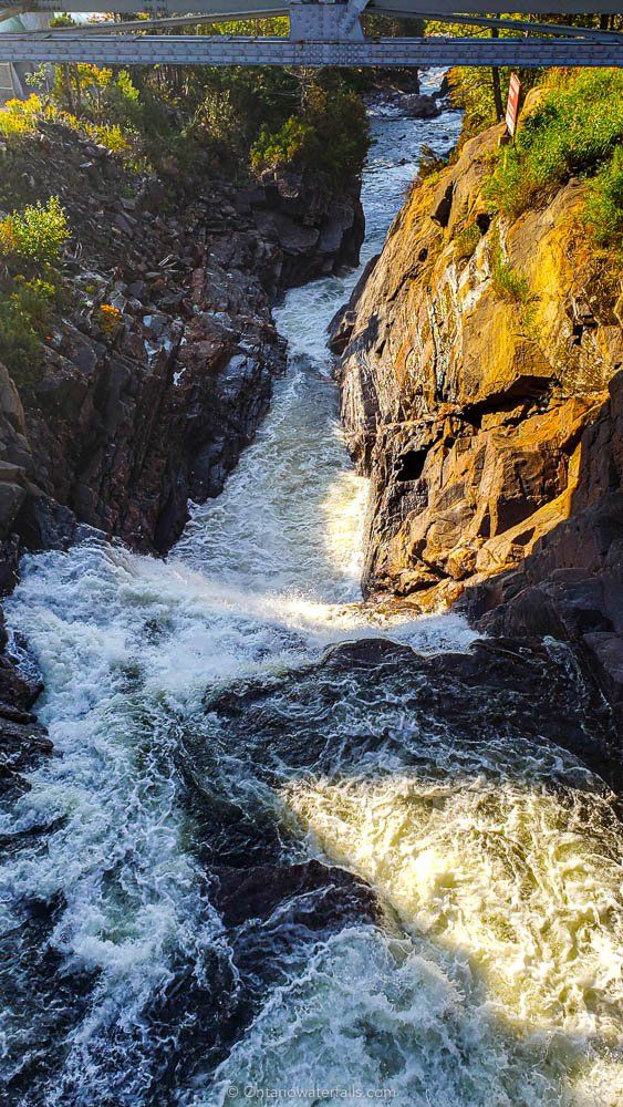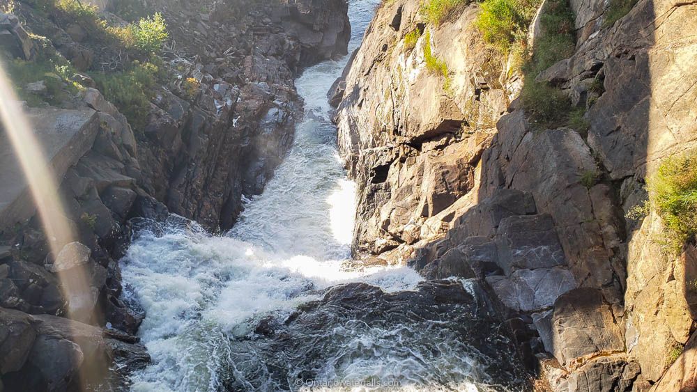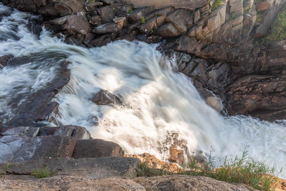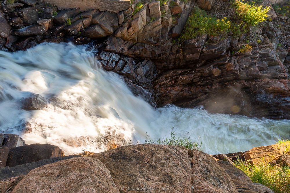 Over time the power of the water has carved a large gorge into the land as the water rushes constantly and erodes away at the rock., The river tumbles down a steep narrow chute cut into the Canadian Shield.